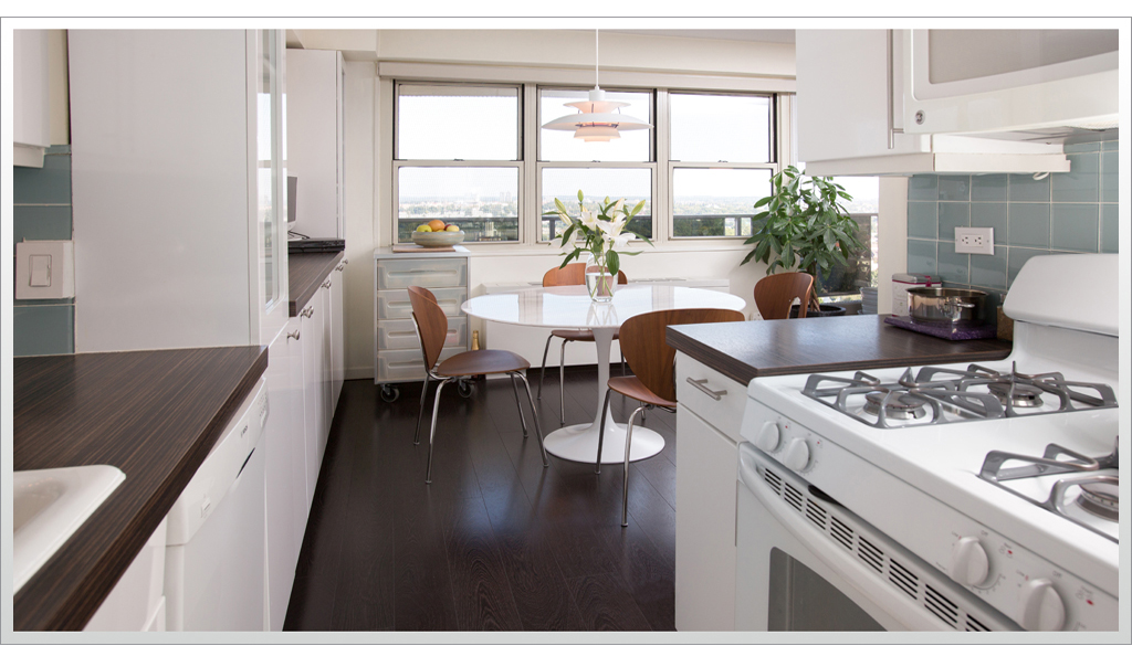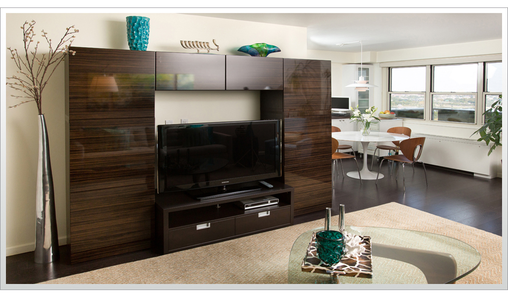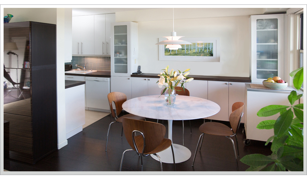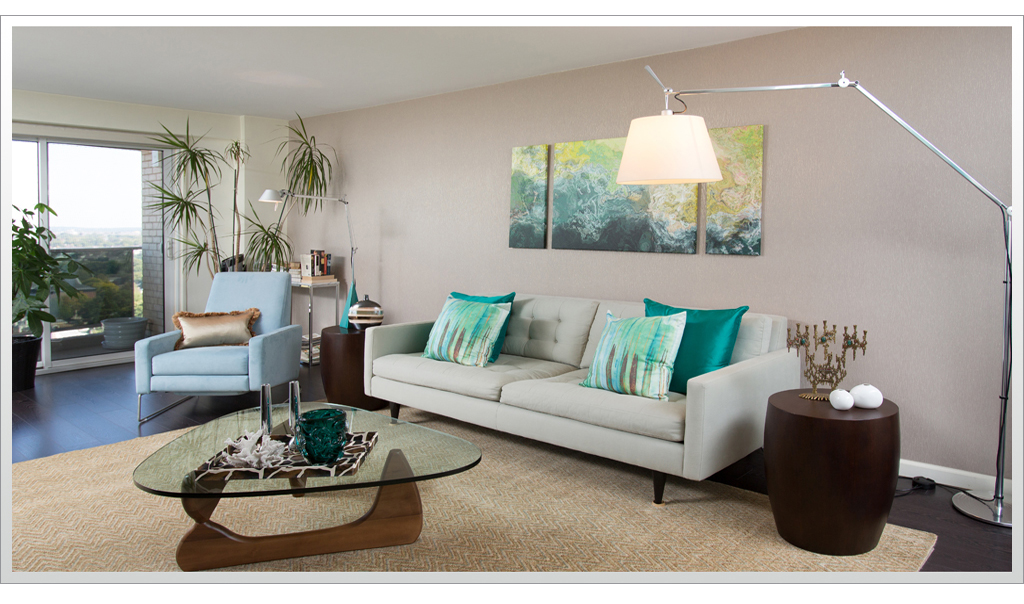Rich dark floors and light walls provide a warm backdrop for pops of greens and blues throughout this contemporary residence.